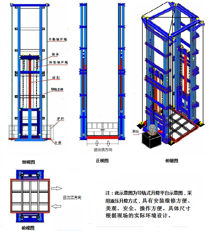 導(dǎo)軌式升降機(jī)是一種非剪叉式液壓升降機(jī)設(shè)備·用于二三層工業(yè)廠房,餐廳,酒樓樓層間的貨物傳輸·低高度在150-300mm,優(yōu)其適合不能開挖地坑的工作場(chǎng)所·并且無須上部吊點(diǎn),形式多樣化(單柱,雙柱,四柱).設(shè)備運(yùn)行平穩(wěn),導(dǎo)軌式升降機(jī)的導(dǎo)軌一般為方管、H鋼,方管焊接制成,操作簡(jiǎn)單可靠,貨物傳輸經(jīng)濟(jì)便捷· 大承載10噸,實(shí)現(xiàn)多點(diǎn)控制,上下樓層互動(dòng)聯(lián)鎖,達(dá)到安全使用;提升高度高,采用旁置油缸、或雙測(cè)式油缸,運(yùn)行平穩(wěn)、無噪聲、維修方便、使用壽命較長;停電手動(dòng)下降、緊急停止按鈕,方便、快捷、實(shí)用; 地坑深度一般為15cm-30cm,頂層高度不受限制,可根據(jù)現(xiàn)場(chǎng)環(huán)境定做用;層門可貫通,廠房?jī)?nèi)外可相互戳開,方便、節(jié)省空間;特別適合2-3層鋼結(jié)構(gòu)廠房,內(nèi)外部均可使用。